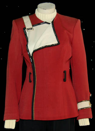 Description: A Starfleet captain’s uniform featured in Star Trek VII: Generations. The costume is black trousers with elastic ankle cuffs and red stripes down the outside seam of the legs with gold centered piping, a white command division long sleeved undershirt with a ribbed collar and cuffs, and a maroon officer’s jacket with an affixed red placement and a resin badge indicating the wearer to be the rank of ‘captain’, with an affixed white command division strip around the left forearm (which is hanging on by a thread) with two gold colored metal ’10 year service’ pins featuring molded in Starfleet emblems, and three gold colored metal commendation bars. The jacket also features two black sewn on belt loops, black piping around the double breasted flap, white interior lining inside, snaps separated by silver colored metal chain accent, a black interior lining, and an affixed white command division strip on the right shoulder with an affixed ‘security device’. The costume features a sewn in Star Trek VII tag reading ‘D. Kasman’. A production guide indicates wear by ‘Dale Kasman’ who in photographs appears wearing admiral ranks. There is no indication as to when or why the costume was devoted to a captain ranked character.