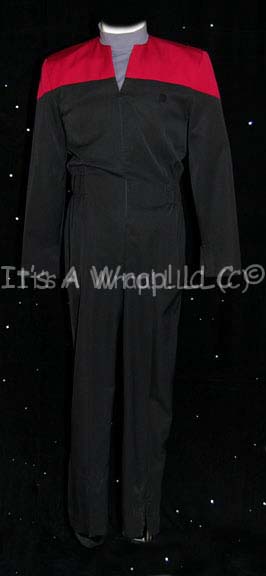 Description: This Starfleet uniform jumpsuit is black with Command Red division shoulders that zips up the front, clasps at the top, and features a Velcro patch on the left breast for a Starfleet ‘commbadge’ (sold separately). The waist features form fitting black elastic with sewn in loops for ‘away team’ gear, the feet end in black elastic stirrups. The costume comes with a gray turtleneck undershirt that zips up the back. The costume has a small hole in the seam under the left arm. A sewn in Voyager tag in both garments reads ‘John Bruegl’, a second tag in the jumpsuit sets the size at ‘46’ with the undershirt set at ‘42’