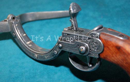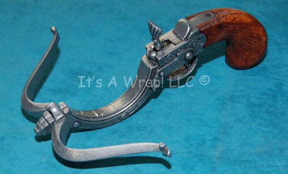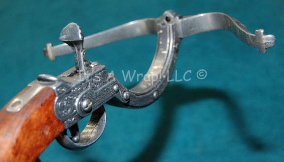 Description: A prop item similar to those featured in the Star Trek: Voyager episode “Concerning Flight” and the Enterprise episode “Civilization. This item is a non-working, pewter-colored metal, miniature, weapon featuring intricate carved designs and a weathered wooden handle; it is small enough to fit in a cloak, has had the bolt removed, and there is a hammer you pull back that, if the item were functional, would pull the bow taut and let the bolt loose when you pull the trigger underneath. The item measures approx. 12 X 8 X 3.5 inches.