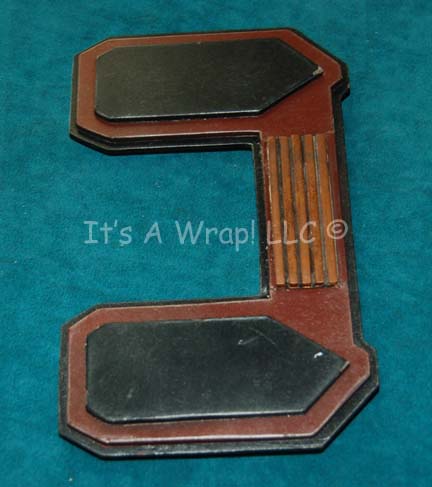Description: A prop item featured in the Star Trek: Voyager episode “Body and Soul”; wherein “Seven of Nine” (Jeri Ryan) must download “The Doctor’s” (Robert Picardo) program into her neural implants to save him from a race of holo-phobic aliens who are at war with the holograms they created and refer to them as “holographic insurgents”. This item is a P.A.D.D. (Personal Access Display Device) used in the medical bay of the Lokirrim ship; it is resin cast in brown, roughly the shaped of a squared-off capital “C”, copper-colored, textured accents in the middle where it would be held, black trim and further black, raised, accents on the back. Irregularly shaped “screens” with a graphical application of a gold oval divided into four parts with a background print of bolts of electricity, horizontal, black detail, Lokirrim script and around the oval and a red ball of energy in the middle; the second “screen” is similar but with less script and what appears to be an off-center targeting diagram. The item measures approx. 7.5 X 4.5 inches.
