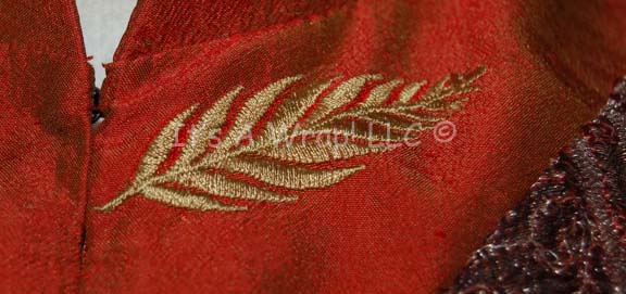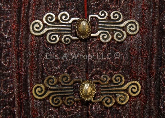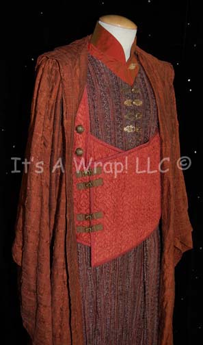 Description: A costume featured in the Star Trek: Enterprise episode “The Awakening”; wherein “Captain Archer” (Scott Bakula) and “T’Pol” (Jolene Blalock) encounter a radical sect of Vulcans called the “Syrrannites” who are being blamed for the bombing of the “Earth Embassy”. This costume is “Surak” (Bruce Gray), the Vulcan ‘Father of Logic’, an iridescent silk tunic with sage-colored embroidered leaves, woven rust-colored, overall-style, trousers; a waistcoat made from puckered silk with faux brass buckle/clasps, brass colored buttons, a sleeveless maroon, robe that features textured gold thread brocade, tiny burgundy thread flowers, carved, faux buttons, clasps and an interior waist belt with clasps. A full-length, copper-colored robe featuring a white thread checkerboard design, a raised waffle-board pattern on top, large, open, bell-sleeves, and attached hood. The components all feature sewn in Enterprise tags reading ‘Bruce Gray 084’ and the costumer’s tag reads ‘Enterprise 084, Surak, Bruce Gray’ and indicates the components. There is one hole in the knee of the left leg on the trousers; there is no indication as to whether or not it is intentional distress.