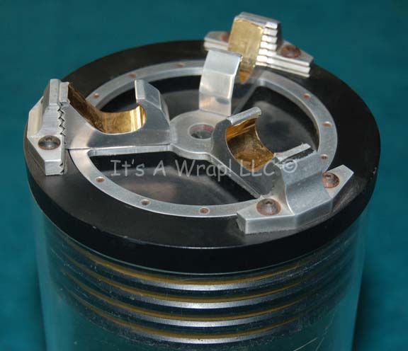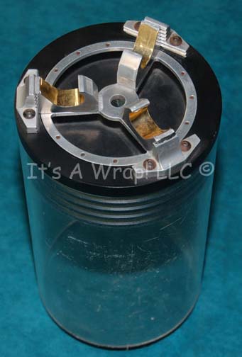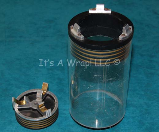 Description: A prop container appearing the Star Trek: Voyager episode “Body and Soul” used by “The E.H.M. Doctor” (Robert Picardo). The item is a medium sized clear plastic container with a molded resin cap that features a trio of latches for a removable cap. The latches fit flush into a series of grooves cut into the metal catches and are mounted into a metal ring. The interior of the plastic container depicts scuffing due to the movement of stone contents held within. The item measures approx. 9.75 X 5 inches diameter.