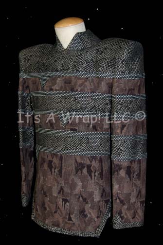 Description: A costume element featured in the second part of the Star Trek: Deep Space Nine two part episode “The Maquis”; “Commander Sisko” (Avery Brooks) tries to rescue “Gul Dukat” (Marc Alaimo) and avoid a war between the Maquis and the Cardassians. This item is the jacket of “Drofo Awa” (Michael Bell), captain of a Xepolite freighter caught by “Commander Sisko” and “Gul Dukat” (Marc Alaimo) smuggling weapons in the Demilitarized Zone, it is camouflage gray with black patterned stripes and plastic dotted accents. A sewn in Deep Space Nine tag reads ‘Michael Bell’ and the costumer’s tag reads ‘441 The Maquis pt II, Xepolite captain, Michael Bell’.