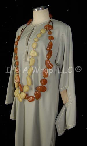 Description: A costume featured in the fourth Star Trek feature film, “The Voyage Home”, as well as variously in future films. This costume is a member of the Deltan species and a member of the Federation Security Council, it consists of a long-sleeved, full-length light-blue gown featuring tan-colored accents on the sleeves, an open, triangular cuff, thin white piping leading down the front to a triangular opening on the chest, a choker/neck dress of brass-colored beaten, metal sheets of various sizes and curled into various angles that ties in the back via gold-colored string, and a gold-colored necklace of numerous, large, polished stones varying in color and size from a yellow-white to shades of orange.