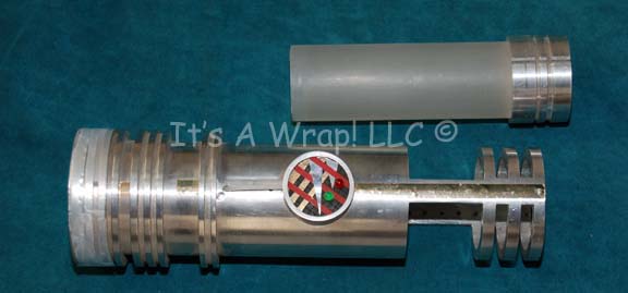 Description: A prop item appearing in the engineering section of the “U.S.S. Defiant” in the Star Trek: Deep Space Nine episode “Starship Down”. The item is a cylindrical container made from machined metal and glass components with embedded lights. The metal cap is attached to a glass container that pulls freely from the item and when inserted depresses an interior know believed to activate the lights on the side. The item is powered by two 9volt batteries held internally where a switch is also present. At this point no electronic functionality could be performed. The item measures approx. 11 X 3 inches diameter. The item appeared briefly onscreen with “Miles O’Brien” (Colm Meaney).