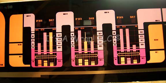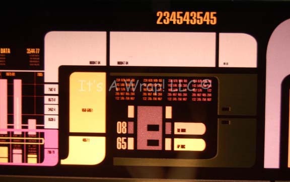 Description: An LCARS style panel (Library Computer Access and Retrieval System) believed to have appeared in Star Trek IX: Insurrection. The item is an asymmetrical sheet of smoked acrylic with a multi-colored graphical application applied to the reverse that is best viewed when back lit by an external light source. The face of the item is adorned with metallic gold colored adhesive detail. The graphic represents several static gages listed as ‘Ops Data’ and one side bar depicts the item as ‘Long Range Sensors’ and ‘Metaphasic Radiation’. The item measures approx. 9.75 and 42.5 at the bottom, while the top is 35 inches due the item’s trapezoid shape.