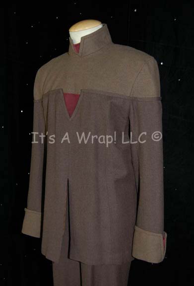 Description: A costume featured in the Star Trek: Deep Space Nine episode “Who Mourns for Morn”; wherein the ever silent staple of “Quark's”, “Morn” (Mark Allen Shepard) dies and leaves everything to “Quark” but some of his previous business associates arrive on the station with other ideas. This costume is that of one of the aforementioned business associates, “Hain” (Gregory Itzkin), it consists of a long-sleeved jacket featuring brown along the shoulders and dark brown beneath that, maroon accents, oversized cuffs, an unattached, pin-backed, large metal brooch featuring multiple shapes and textures, and matching overall-style trousers. Gregory Itzkin has also played such characters as the arrogant Vulcan “Captain Sopek” in the Enterprise episode “Shadows of P’jem” and ‘Mirror Universe’ character “Admiral Black” in both parts of the “In a Mirror, Darkly” story arc.