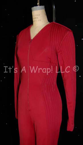 Description: A costume featured in the Star Trek: Enterprise episode “Anomaly”; wherein the ship is damaged by spatial anomalies and raided by pirates. This costume is worn by the MACO’s, in this instance “Corporal Hawkins” (Sean McGowan), under their EVA suits, it is a long-sleeved, full-length, red jumpsuit featuring multiple lines of tubing along the shoulders, ribs, outer arms, and down the legs to give it a ribbed appearance, attached feet, and a zip down the front. A costumer's tag reads ‘Enterprise #54 Anomaly, Hawkins, Sean McGowan’. “Corporal Hawkins” met his end inside one of the Spheres in “The Expanse” protecting his team while they attain the “redundant memory core” of said sphere.