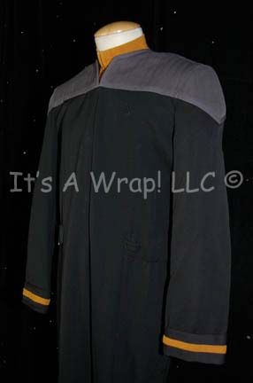 Description: A costume featured in the ninth Star Trek feature film “Nemesis”. This costume is a stunt version of the Starfleet uniform for “Lt. Commander Data” (Brent Spiner), it is comprised of a full-length black jumpsuit with gray quilted shoulders, black elastic stirrups at the feet, a form fitting elastic waistband sewn inside with attached loops for ‘away team’ gear, a Velcro patch on the left breast for a commbadge (sold separately), and an Operations Gold division stripe at the cuff. The uniform zips up the front and comes complete with a separate long-sleeved undershirt matching the division cuff color. The costume has extra fabric under the arms and between the legs to give extra flexibility like stunt costumes sometimes do and also has a small inseam tear on the left leg. A sewn in tag reads ‘Data, Stunt-D, Brian Williams, Water’. This costume was the one worn in the scene in “Insurrection” where”Data”, but in this case, his stunt man is in the lake where the cloaked holoship is being hidden denoted by the label “Water” in the tag.