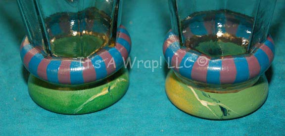 Description: A pair of octagon shaped clear glass drinking vessels featured in the Star Trek: Enterprise episode “Azati Prime”. Appearing during scenes when “Degra” (Randy Oglesby) and his crew are toasting to their impending success, the items are ‘Victoria and Richard MacKenzie-Childs LTD’ name brand glasses painted with blue and purple stripes and a green strip around their bases. The items measure approx. 5 X 3 inches diameter at their lip.