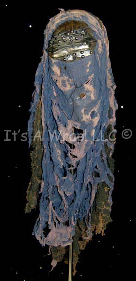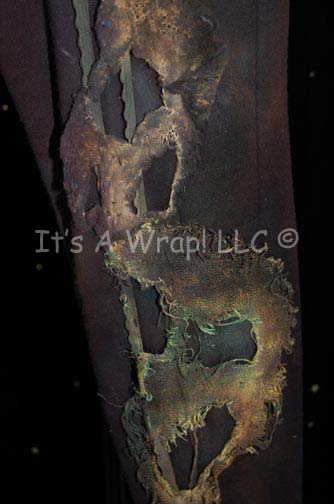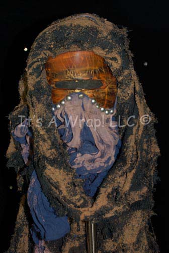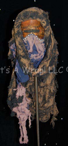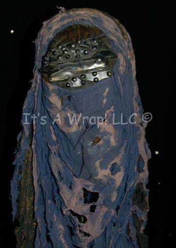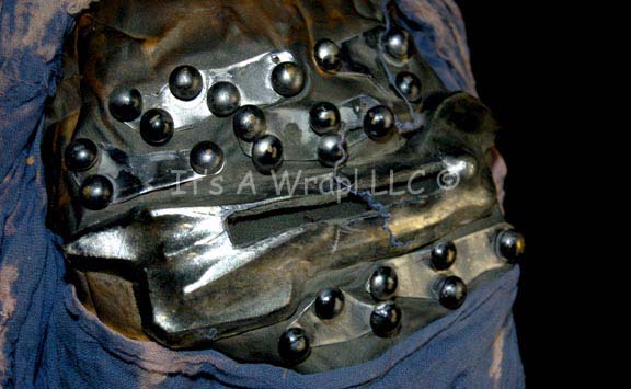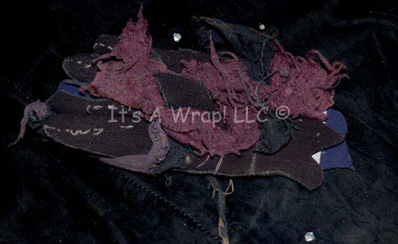 Description: A lot of costume elements featured in the second Star Trek feature film “The Wrath of Kahn”. This lot consists of several items worn by several of “Kahn’s” (Ricardo Montalban) henchmen; two black trousers, both intentionally distressed, with pieces of fabric sewn onto them in an attempt to make them look like were patched and repaired from found objects. There are small holes, rips, and tears, as well as stains, fraying, and ‘patch-working’ throughout. One of the trousers is open all along the back and one is open along the leg but “sewn” back together with lacing and has a sewn in Paramount tag that reads merely ‘Valentine’. Included is a gray, leather choker that retains its softness despite the ensuing twenty-six years and is decorated with multi-colored bits of wire and metal arranged into an aesthetic design. A head wrap composed of multiple strips of blue and gray fabric bound together that completely covers the head and featuring a rubber and plastic “face mask” with a visor to “see out of” in the middle and is denoted for wear by Tim Culbertson as “Khan’s Henchman #3”. A pair of leg wraps composed of quilted under fabric with multiple pieces of further “ragged” fabric attached and generally torn, frayed and distressed in the same way as the previous items and featuring a metal attachment. Another fully-encompassing head wrap with the fabric in blues and oranges this time, a similar rubber and plastic faceplate, metal-colored studs and similar distress; a black glove with half the fingers cut off, distressed with plastic “claws” attached and a plain, un-distressed black glove. A pair of boots covered in faux fur and corresponding distress, brown leather and sand from production still adhering to the soles.