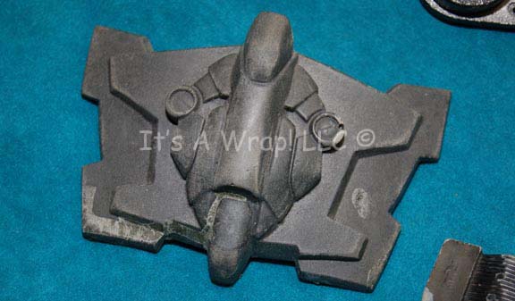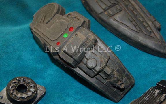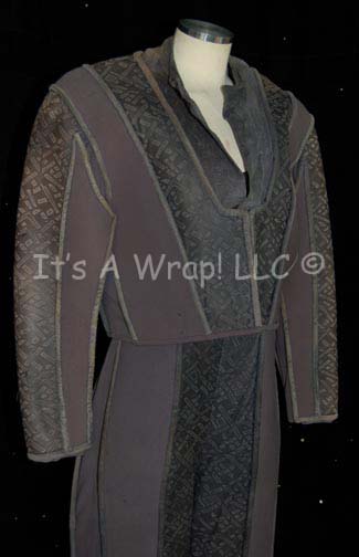 Description: A costume featured in various episodes of Star Trek: Deep Space Nine for wear by Jem’Hadar soldiers. This costume consists of a sleeveless, full-length, jumpsuit with the top half a black, spandex-like material, the bottom being neoprene over a gray fabric featuring a starburst pattern down the middle and stirrups for the feet. A distressed jacket matching the lower-half of the jumpsuit, and faux suede around the collar, multiple loose costume accents with rubber, resin, or metal components and some with Velcro placements. Multiple sewn in tags denote wear by multiple users.