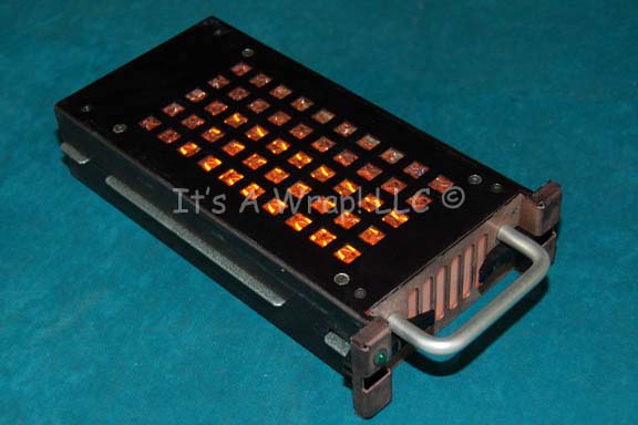 Description: A prop item believed to be featured in an episode of Star Trek: Enterprise. The item is a black metal case with multiple square openings for light to shine through, a pull handle on one end, and a series of rubber faux buttons on the other. The item lights up when a three position switch is activated on the reverse, one position allows the item to glow blue, the other direction equates to red-orange. The item measures approx. 10.5 X 5.5 X 2 inches.
