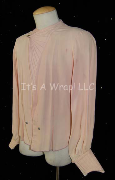 Description: A costume top featured in Star Trek IV: The Voyager Home for wear by William Shatner in his portrayal of “Admiral Kirk”. The shirt is salmon-colored with an asymmetrical front that snaps diagonally up the right side and loops around a silver-colored button at the top. The cuffs feature Velcro seals and the shirt appears to be faded and stained from use. The item is presumably one that was used during underwater, rain, or swimming scenes in production. This style was also seen throughout Star Trek III: The Search for Spock. The sewn in Western Costume Co. tag reads ‘William Shatner' and an odd costumer’s tag reads ‘Cmmdr Kirk’s Shirt, William Shatner, Star Trek IV’.