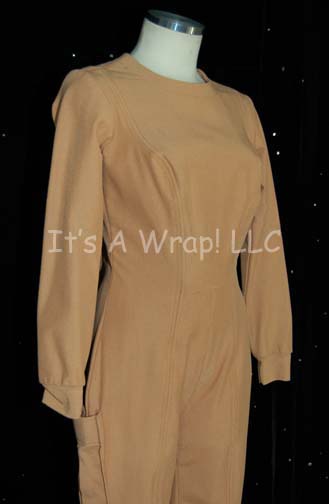 Description: A costume similar to those featured in Star Trek I: The Motion Picture. This costume is a tan, class-D, Starfleet uniform jumpsuit featuring an unattached plastic bio-monitor, an unattached pair of orange sciences division-rank strips for the shoulders with inverted triangle accents indicating the wearer to be a ‘chief petty officer', and an orange backed Epsilon IX assignment patch for the left breast. The costume is intended to be worn by male actors. A sewn in Western Costume tag reads ‘H. Teague’ and a costumer’s tag reads the same.