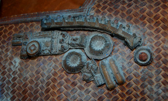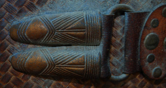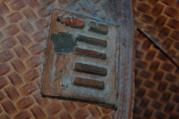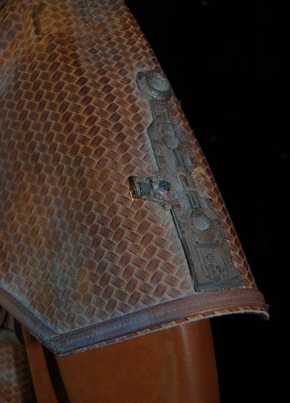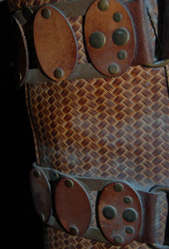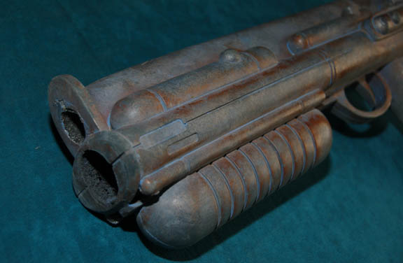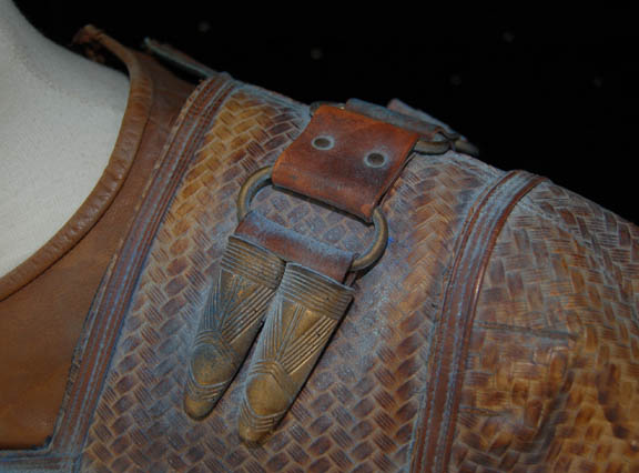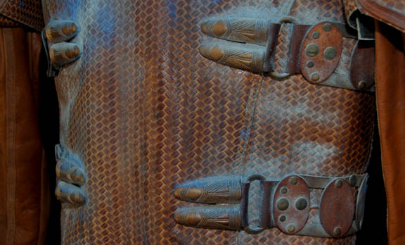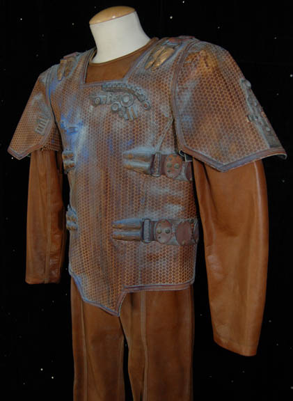 Description: An elaborate and highly detailed leather mine guard costume with a species specific prop weapon featured in the Star Trek: Enterprise episode “The Xindi”. The costume consists of a long sleeved leather undershirt that zips down the spine, and a short-sleeved overcoat with openings for the undershirt sleeves to come through. The overcoat is made of a neoprene interior with braided patterned leather making up its exterior; a zipper seals over the spine. A leather belt attached to the front with metal rings attaches via Velcro at the spine; the overcoat also features other leather and metal details and blue painted “aging” around them. The costume also contains brown leather trousers that fit down into excellently detailed boots. The mine guard prop energy carbine is made from sturdy molded rubber, painted and aged to match the costume and measures approx. 18.5 X 7 X 3.75 inches. The costume features sewn in Enterprise tags, and a corresponding costumer’s tag is present.