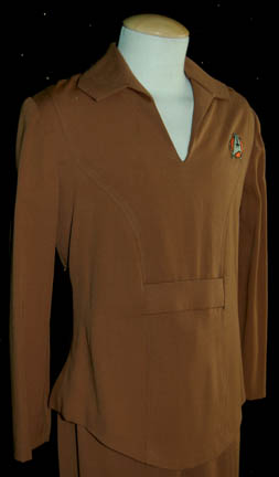 Description: A brown colored Starfleet Class-A uniform with a collar featured in Star Trek I: The Motion Picture. This costume consists of brown trousers and a collared shirt featuring a sewn on sciences orange backed Starfleet emblem patch on the left breast with an attached bio-monitor; brown plastic with a black adhered label and metallic silver colored details to suggest technology. The item has minor distress due to time and storage including a small hole on the right side of the collar but is the last Class-A, collared uniform shirt thus far located.