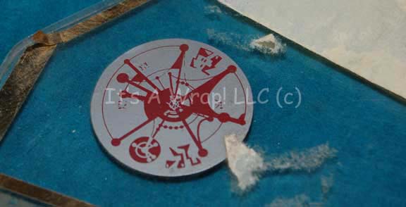 Description: A series of NUMBER clear acrylic sheets created as part of the science lab console in the Star Trek: Deep Space Nine episode “Playing God”. The items are fashioned to fit into a round console and each features a pair of circle shaped Cardassian themed graphical applications on the inner edge. Two of the items are covered in adhesive tape, some part of which are inscribed ‘science station’ and ‘save’.