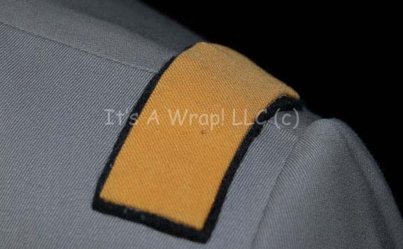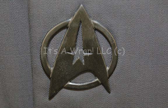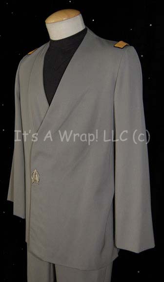 Description: A gray colored Class-C Starfleet uniform featured in Star Trek I: The Motion Picture. The costume is a set of trousers with a fold over size adjustment at the ankles, a black sleeveless undershirt with a zip up the spine, and a gray cropped sleeve jacket wrap that features a pewter-colored, metal Starfleet emblem affixed to the asymmetrical double front, and a pair of affixed Operations Yellow division strips on the shoulders. The costume features a sewn in Western Costume Co. tag that indicates the size to be ‘42’ and the jacket has an inner waist tie. This costume has very minor fading but is otherwise in excellent condition barring its age.