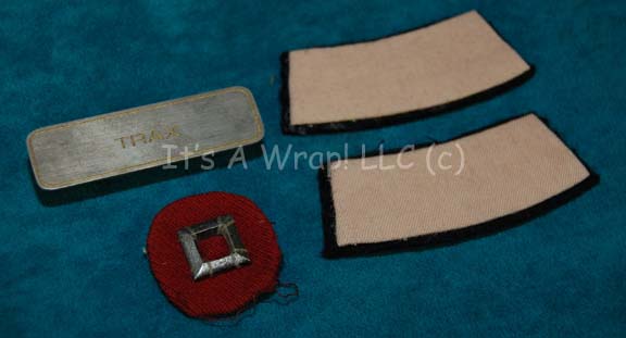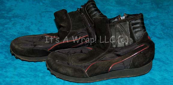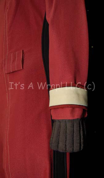 Description: A costume like those featured between “The Wrath of Kahn”, and the opening scenes of “Generations”. This costume is a long-sleeved, burgundy jumpsuit featuring tan shoulders, black piping, black ribbing around the collar and cuff, Command white cuff on the left sleeve and matching, unattached shoulder division strips, belt loops around the waist, and a black stripe that follows the length of the arm, down the ribs and ends at the ankle cuff. Included is a resin-cast, pin-backed Starfleet emblem, a pin-back badge denoting the non-commissioned rank of “Chief Petty Officer”, a silver and gold-colored badge engraved with the name ‘Trax’, and a pair of black “Puma” athletic shoes with red accents of the Starfleet insignia with wear from time and storage. There are clasps, Velcro, snaps, and a zip down the back.