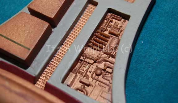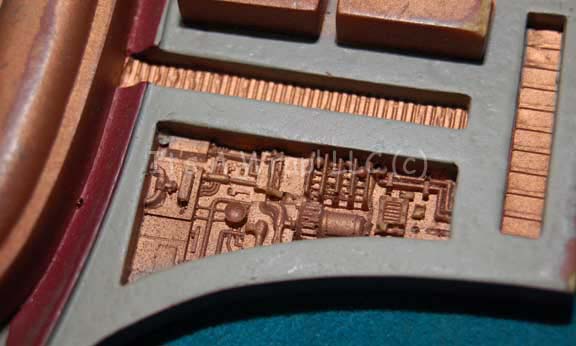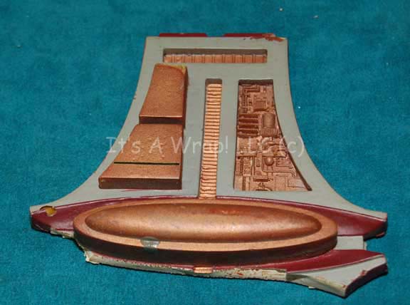 Description: A broken Cardassian door button panel like those appearing variously in episodes of Star Trek: Deep Space Nine. The item is made from molded resin painted metallic bronze with raised accents. A full half of the item is broken away and not expected to be recovered. Measures approx. 3.5 X 4 inches and the reverse features remaining adhesive from set use.