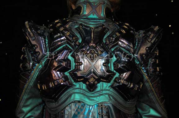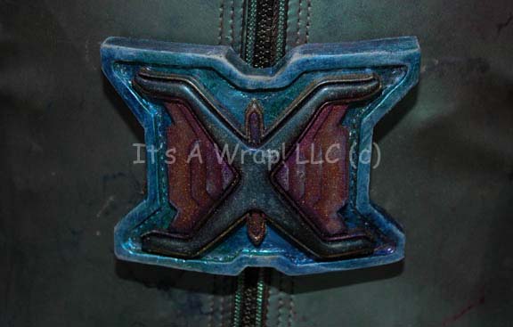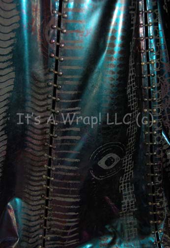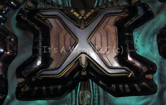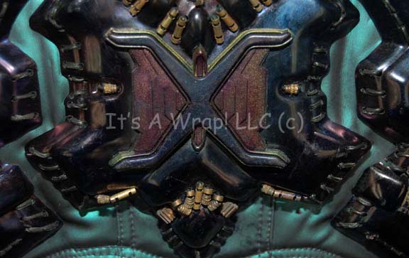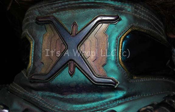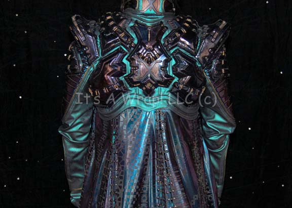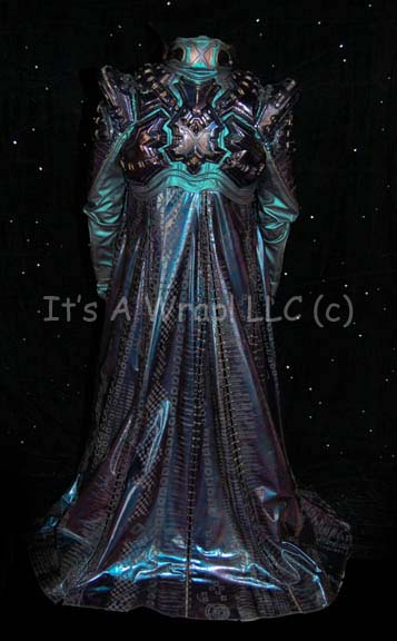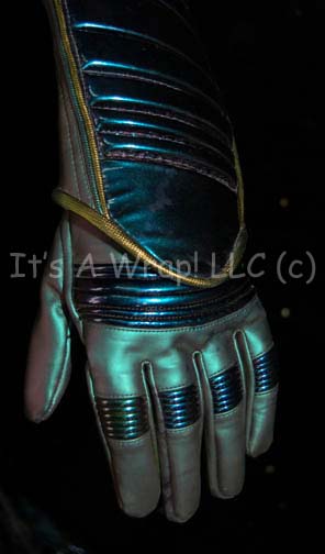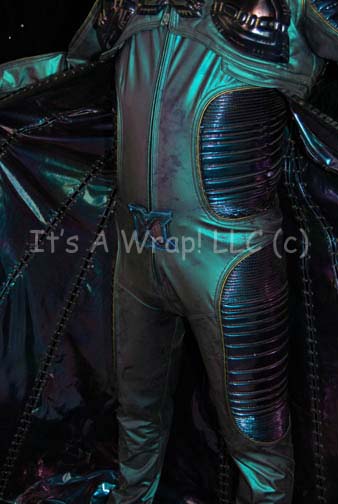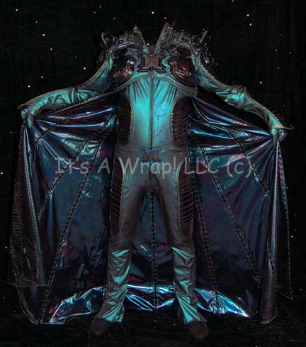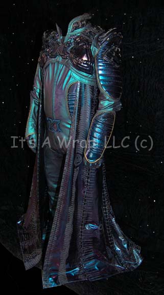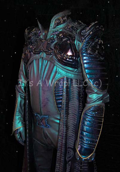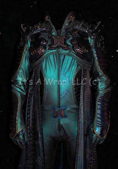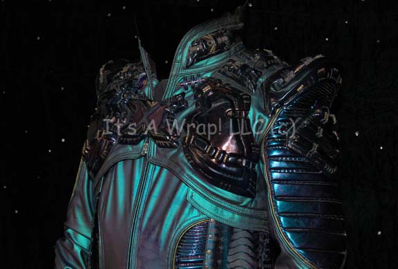 Description: A costume featured in the last Star Trek feature film, “Nemesis”. This costume is a combination of character elements made for wear by Ron Perlman and labeled ‘Ron’ and a stunt item labeled ‘Todd’ for his stunt man; it is made from shiny iridescent purple material with multiple molded accents and sewn in metal embellishments. It is composed of these separates: a black undershirt to prevent chafing, a set of overalls, a full length cape, and a uniform jacket with shoulder armor. The overalls are purple with multiple padded points and matching material over the shoulders and around the arms, Velcro placements correspond to the cape. The cape is nine lengths of iridescent purple material with painted on patterns, all formed together with metal work, with holed openings for the arms made from olive colored fabric. The uniform jacket matches the overalls, is inscribed internally ‘Todd’ and ‘Ron stunt’, is long sleeved with inside wrist zips, gold colored piping, molded ‘armor’ pieces affixed to the chest, back, and shoulders, and cropped to the upper chest with a center zip that is hidden by a molded ‘X’ embellishment. The costume also comes with a molded Reman ‘X’ ‘buckle’ accent to affix to the Velcro placement waist high on the overalls. The jacket is labeled ‘Ron’, the cape ‘Ron #3’ and the overalls as ‘Todd’.