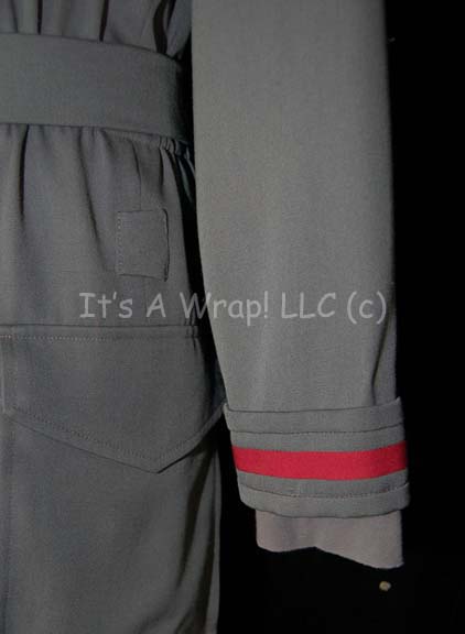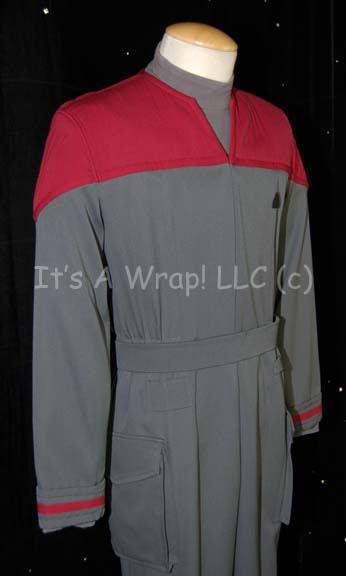 Description: A costume featured in the Star Trek: Deep Space Nine episode “Valiant”; wherein “Jake Sisko” (Cirroc Lofton) and “Ensign Nog” (Aron Eisenberg) are rescued from attacking Jem'Hadar by the Starship “Valiant”, a Defiant-Class ship crewed solely by members of the elite Red Squad. This costume is the latest incarnation of the Starfleet cadet uniform consisting of a long-sleeved, full-length, gray jumpsuit featuring quilted, Command Red shoulders, further Red stripes around the cuffs, a Velcro patch for a commbadge (sold separately), hoops at the waist for ‘away team gear’, pockets on each trouser leg, a matching belt, a zip down the front, stirrups for the feet, and a long-sleeved blue-gray undershirt. A sewn in Deep Space Nine tag in the jumpsuit and on the belt reads ‘Adam Shoshan’.