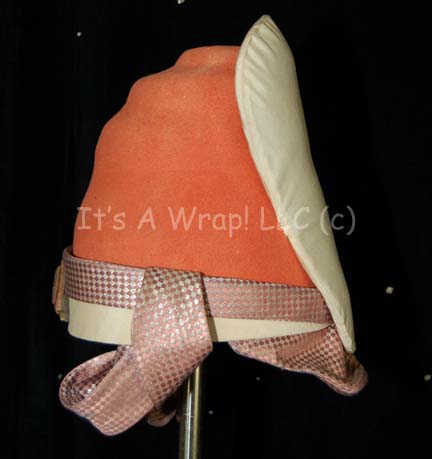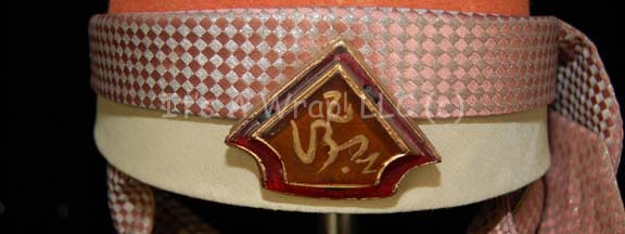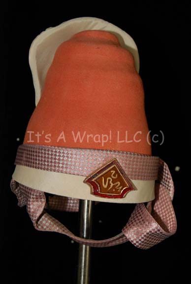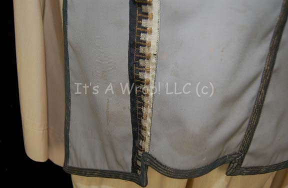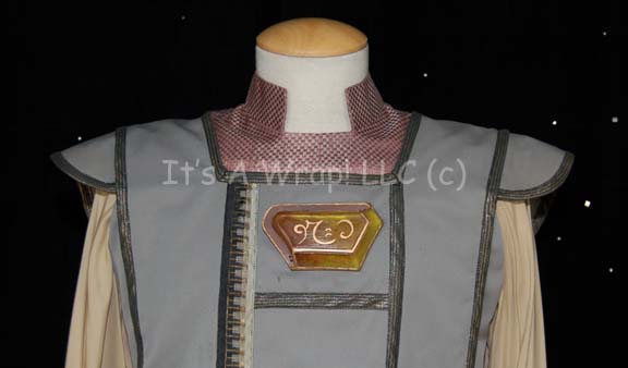 Description: A costume like those featured near the end of “The Search for Spock”, the beginning of “The Voyage Home”, and various instances in other episodes and films. This costume consists of an off-white tunic, tan-colored bell-sleeves of a slightly finer fabric, a dickie sewn on top featuring a reflective silver and violet checkerboard pattern and trousers matching the fabric of the sleeves. A sleeveless, gray tabard featuring gold-highlighted, black stripes across and down the front and back, white, black, and gold stripe down the right side, and trapezoidal-shaped, faux jewel with Vulcan iconographic symbol. Included is a rust-colored, Vulcan-style hat featuring trim and chinstrap of the same checkered pattern, addition trim in a tan color, and another faux jewel in a stylized arrow shape. The tabard has minor staining due to time and storage. A tag in the hat reads ‘Jay Crimp, 2-1’; an accompanying costumer’s tag reads ‘Vulcan Electrician, sc 34-36, Int. Bird of Prey’, and a sewn in tag in the costume reads ‘2-2’.