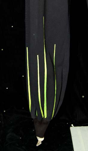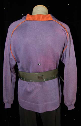 Description: A costume featured in Star Trek V: The Final Frontier like those made for wear by William Shatner as “Captain Kirk”. The costume is a rock climbing outfit composed of black trousers with neon green streaks in the lower legs, an iridescent purple sweater with orange fabric accents and collar, a climbing belt, and a pair of Boreal name brand climbing shoes with laces. The costume maintains minor distress in the form of a small hole over the spine and twin holes along the seam on either side of the waist that seems to have been done intentionally; fading due to either time and storage or purposefully is also evident but is still, overall, in quite good shape. The items feature no sewn in tags, inscriptions, or costumer’s tags.