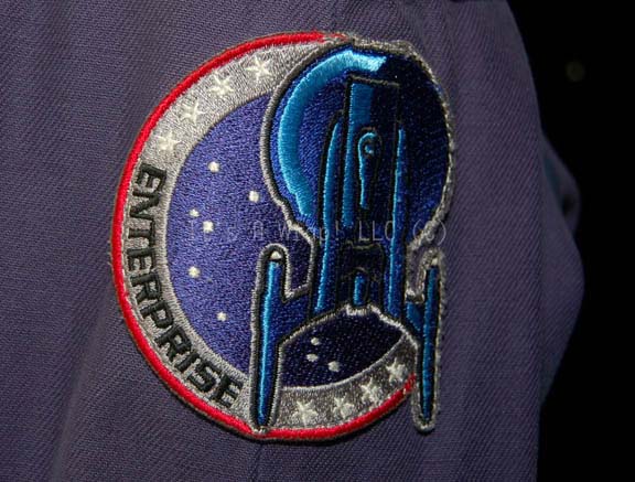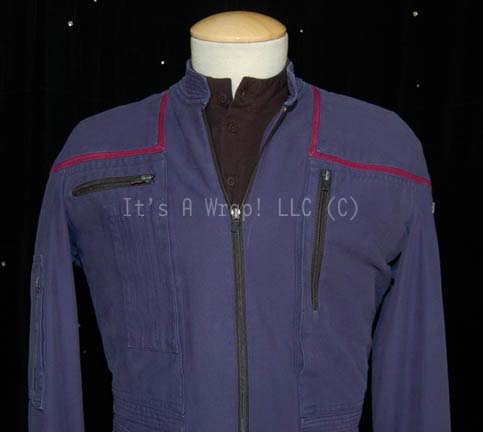 Description: A costume featured in various episodes of Star Trek: Enterprise. This Starfleet uniform jumpsuit includes the famous ‘Enterprise NX-01’ left shoulder patch with Operations red division strips around the shoulders. “Enterprise” costumes feature multiple zippered pockets, Velcro size adjustments and zippers at the wrists and ankles, come with detachable shoulder pads, and a black, button up, long sleeved undershirt. A sewn in Enterprise tag in both items reads ‘Larry Tolliver’ and ‘Brian Bennett’.