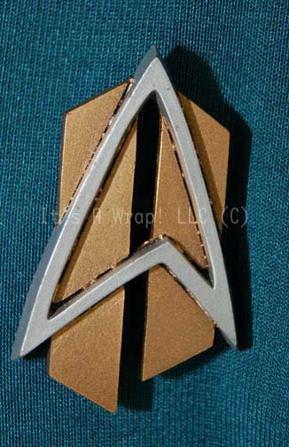 Description: A costume featured in the finale episode of Star Trek: Voyager “Endgame”. This costume is the future-style Starfleet uniform and was worn at the tenth-anniversary party sequence earlier in the first part of the episode, it consists of a long-sleeved, full-length, Sciences Blue jumpsuit featuring a false, wrap-around front, black piping across the chest, a Velcro placement for a commbadge (included but not attached) and black trousers. The interior lining has begun to deteriorate due to time and storage. A sewn in Voyager tag reads Brenda Kaye’ as does an attached costumer’s tag.