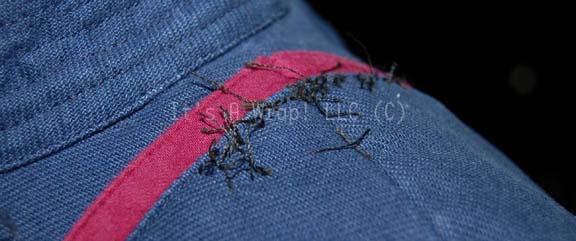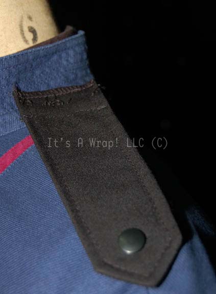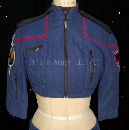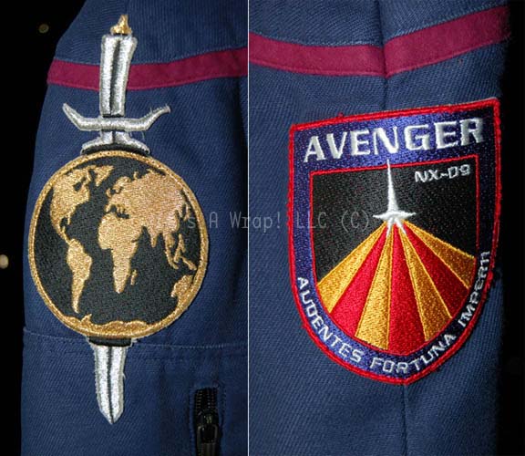 Description: An extremely rare costume featured in the Star Trek: Enterprise episodes “In a Mirror, Darkly, Parts I and II”. This costume is a Starfleet Uniform from the Mirror Universe, thus it consists of hip hugging cropped trousers with a midriff bearing cropped uniform top with cropped sleeves. The uniform features Operations red division strips around the shoulders, black epaulettes secured by a button because the stitching on the shoulders has come loose, a Terran Empire logo patch sewn onto the right sleeve, and an “Avenger NX-09” assignment patch on the left that reads “Audentes Fortuna Imperii” (The Bold are the fortune of the Empire). The costume features calf length black leather heel boots that zip up the inside and have spandex-like fabric on the back. A sewn in Enterprise tag in both items reads ‘Cecilia Specht, #94’ and ‘Kassandra Nelson, #95’.