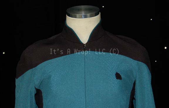 Description: A costume featured in various episodes of Star Trek: The Next Generation and then reused in the seventh Star Trek feature film “Generations”. This costume is for wear by the stunt person for Gates McFadden (Dr. Crusher), Jane Austin, and is a long-sleeved, full-length Starfleet uniform jumpsuit consisting of black shoulders with a Sciences Blue chest, back, sleeves, and piping around the Mandarin collar; a black waist and legs that end in stirrups. This particular uniform has zips that close the front of the costume and features a Velcro patch on the left breast for a commbadge (sold separately). A sewn in Star Trek VII tag reads ‘J. Austin’ and a second tag underneath sets the size at 36 as does the attached costumer’s tag.
