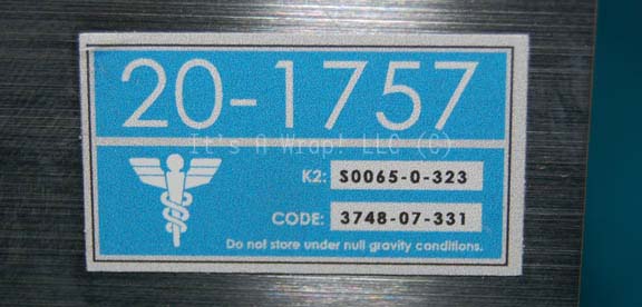 Description: A set dressing piece appearing variously in episodes of Star Trek: Enterprise on the set of sickbay on the “Enterprise NX-01”. The item is a polished metal rack with twelve glass jars that feature screw on black plastic lids. The rack is made for wall mounting as evidenced by a pair of screw holes and hanging slits in the reverse and can set easily on a table or counter surface with the use of rubber feet applied for a no skid effect and features a blue and white Starfleet inventory application on the side. The item measures approx. 9 X 8.25 X 2.5 inches. The jars each measure approx. 3.75 X 1 inch diameter.