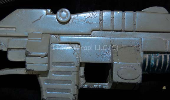 Description: A soft foam rubber molded Andorian carbine like those appearing in episodes of Star Trek: Enterprise like “The Andorian Incident” and “Cease Fire”. The item is painted iridescent blue with a translucent accent and a shoulder strap. The paint is cracked along several of the raised points and surfaces of frequent handling. The item measures approx. 17 X 6.5 X 3.5 inches and represents the last know available Andorian prop firearm in the collection.
