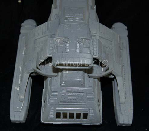 Description: A scale model of a Federation runabout like those appearing in multiple episodes of Star Trek: Deep Space Nine. The item is injection molded plastic painted gray with multiple raised features and openings for view ports. The item is fashioned from several pieces of plastic adhered together and measures approx. 12.5 X 7.25 X 4.5 inches. Remains of adhesive used for a motion control mounting rod are present on the ventral side.