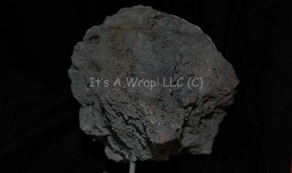Description: A set of five prop asteroids believed to have appeared in the Star Trek: The Next Generation episode “Pegasus”. The items are believed to be volcanic rocks and are mounted on motion control rods each wrapped in fluorescent orange paper, some of the rocks have a degree of the same color painted on them sparsely. The items measure generally 15 X 7.5 X 3 inches.