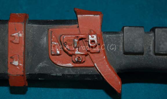 Description: A Klingon knife made for use in Star Trek episodic television. Made of foam rubber the knife is painted black and brown, has faux spikes at the top of the hilt, many textured along the front and back, a small Klingon symbol near the bottom and, on the reverse side, metal clips for attaching the knife to a costume. The item measures approx. 14 x 3 x 1.5 inches.