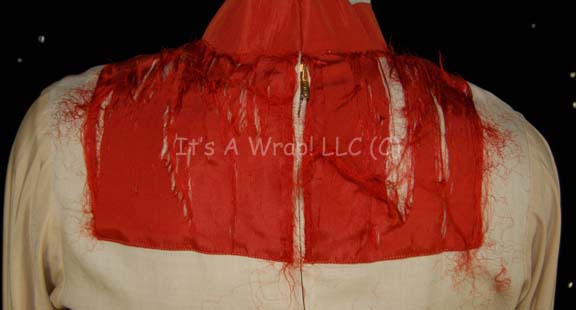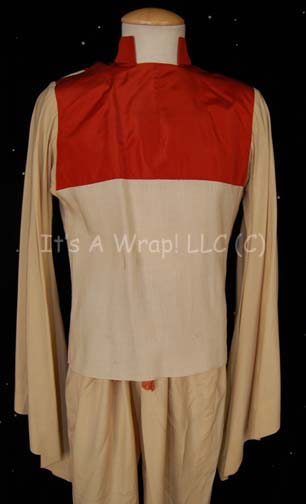 Description: A costume of the style featured in various Star Trek feature films. This costume consists of an off-white under tunic featuring a rust-colored dickie sewn on, large, tan, bell-sleeves of a slightly finer grade of fabric, and matching trousers. A sleeveless, gray tabard featuring stripes that match the dickie, a pink and white checkerboard pattern down the front, and a circular, faux jewel with Vulcan iconographic symbols. Included is a black felt hat in the Vulcan-style featuring copper-colored trim and accent, further rust-colored trim forming a chinstrap and a similar, triangular faux jewel. The back of the sewn on dickie is quite worn and thrashed inexplicably and there are small stains due to time and storage. A sewn in Paramount tag in the costume reads ‘2-1’ and a tag in the hat reads ‘2-8M’.