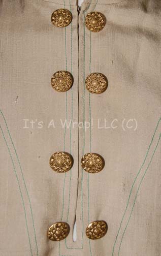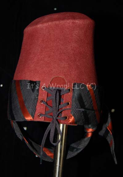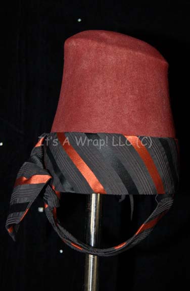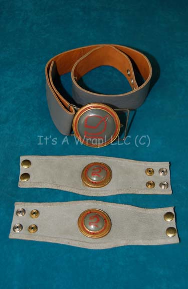 Description: A costume featured in the opening sequences of the fourth Star Trek feature film, “The Voyage Home”. This costume is that of one of the Vulcan technicians who were repairing “Kirk” (William Shatner) and crew’s “commandeered” Bird of Prey before their attempted return to Earth; a long sleeved shirt with a deep open chest that clasps in spite of a number of buttons, a pair of leather bracelets with round resin ‘gems' on them that feature painted Vulcan iconographic symbols, and a leather belt with a similar ‘gem’ that was glued to a silver colored metal Starfleet emblem buckle. A plum colored, felt hat in the Vulcan-style featuring a black and rust-colored sash around the base that becomes a chin strap. Unfortunately, the costume does not include the trousers. A sewn in Paramount tag in the hat reads ‘3-26’.