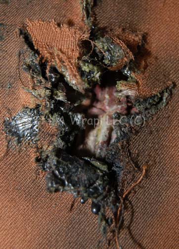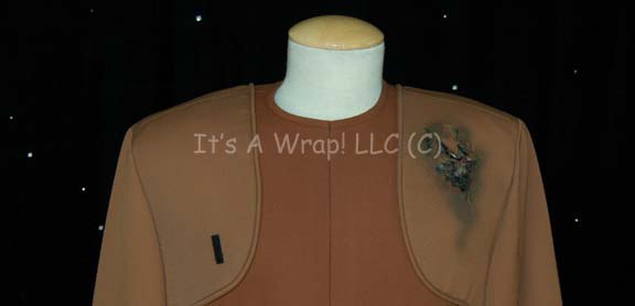 Description: A costume element featured in the Star Trek: Deep Space Nine episode “Sons of Mogh”; wherein this “Kurn” (Tony Todd) brother to “Worf” (Michael Dorn) comes to Deep Space Nine to meet his brother and ask for an honorable death via the “Mauk-to ‘Vor”, or ritual suicide, but ends up taking a position in Bajoran security. This costume item is the jacket of a Bajoran security office, colored brown with mustard sleeves and shoulders with a zip up the center of the front and clasps at the top, a patch for a Bajoran commbadge (sold separately); a special effects application and ‘charred’ material in the left shoulder to denote a phaser blast wound. The interior Deep Space Nine tag reads ‘Tony Todd'.