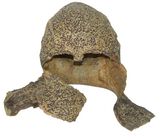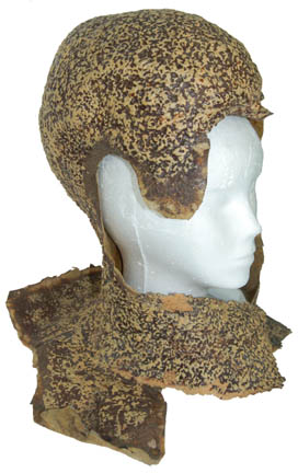 Description: A special effects make-up full head wrap intended to be an adult Suliban appearing variously in episodes of Star Trek: Enterprise. The item is molded foam rubber made to appear blotched and painted brown with a topcoat of tan. The item is in good condition overall with a supple feel generally, the edges of the item are in good condition with some dry areas.
