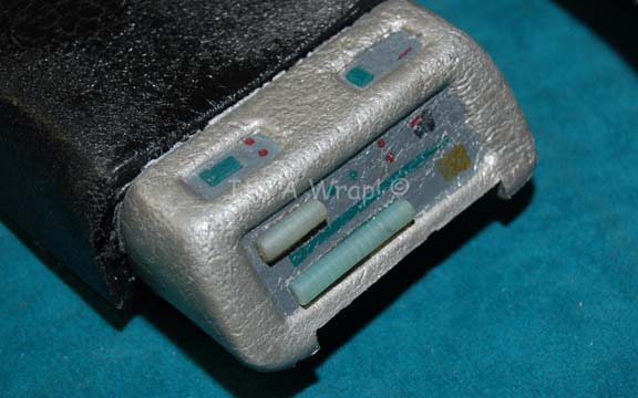 Description: A pair of props featured variously in Star Trek episodic television for use by characters in Starfleet or the Federation, a tricorder and phaser, both molded into holsters. The items are intended to appear as though they can be removed and used. The tricorder is made from soft molded foam rubber with yellow tinted acrylic accents, painted metallic silver, and adorned with graphical applications to suggest hardware, it is part of the holster which features black nylon Velcro loops to fit into ‘away team’ gear loops on costume uniforms (sold separately). The phaser is made from sturdier molded foam rubber, painted metallic silver with similarly painted faux buttons, the holster features wire backs for costumes. The items measure approx. 4 X 3.25 X 2 inches and 7.75 X 2.25 X 2.25 inches respectively. The paint on the items is generally cracked due to the materials made to fashion them.