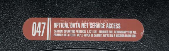 Description: A prop carry case appearing variously in Star Trek episodic television. The item is sturdy molded plastic with a molded handle and flip latches. The sides are adorned with brown colored Starfleet inventory applications reading ‘Engineering Access Only’ and ‘Optical Data Net Service Access’, both of the applications feature realistic instructions that turn into humorous tie-ins. The item measures approx. 15 X 11 X 2.5 inches.