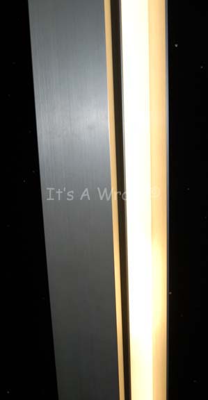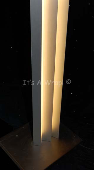 Description: A tall dual directional lamp acquitted for use in Star Trek episodic television or feature films. The item is composed of a sturdy metal base on castors with a pair of long lamps that pivot on their bases to shine out in differing directions, held together at their zenith. The item functions on standard American electricity with a short power cable that features a type-B three prong plug. The item base measures approx. 18 X 15 inches while the lamps folded together measure approx. 2.25 X 4.5 X 83 inches away from the top of the base.