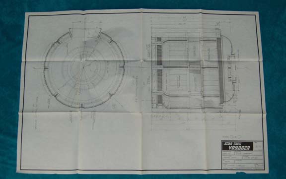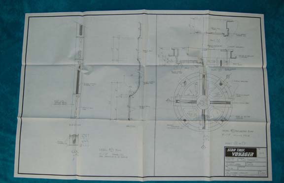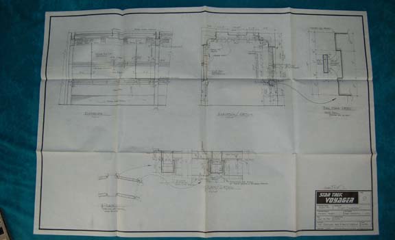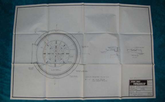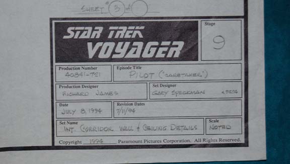 Description: A lot of five schematics for sets featured in various episodes of Star Trek: Voyager. Schematics include details such as ceiling and light plans for the turbolifts as well as corridor wall, ceiling, and door detail. The items feature such information as the show name, stage, and production number, original date, set name, production and set designer on a panel in the lower right hand corner.