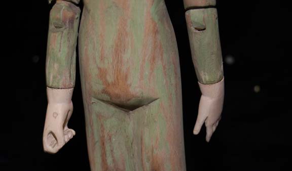Description: A prop item featured in Star Trek: Voyager episodes like “Scientific Method” and “Concerning Flight”. This item is a prop featured in the holo-program of Leonardo Da Vinci's workshop that “Captain Janeway” (Kate Mulgrew) utilized on several occasions. This painted wooden figurine is attached to its base and has jointed arms and hands that are detachable from the body. The attached head swivels and has an intricately carved and painted face. In these instances, “Leonardo Da Vinci” is portrayed by screen veteran John Rhys-Davies. The item measures approx. 14 x 3 ½ x 3 inches.