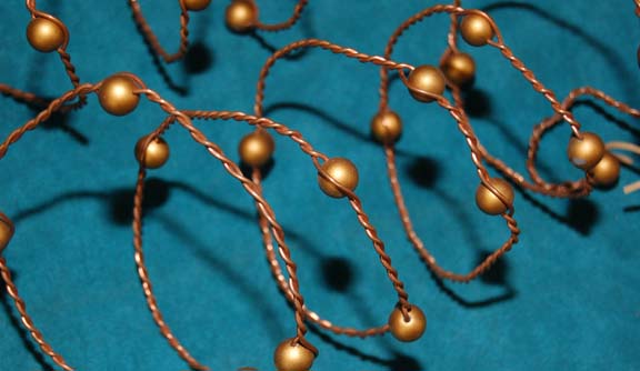 Description: A pair of costume elements in featured in Star Trek feature films and episodic television. These bracelets are oriented in a spiral pattern and consist of copper-colored twisted wire featuring gold-colored beaded accents. The items measure approx. 8 inches and a diameter of approx. 3 inches.
