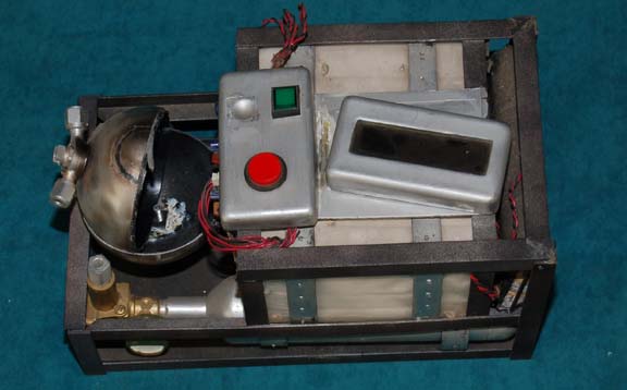 Description: A medium sized piece of technological set dressing appearing in various episodes of Star Trek: Enterprise like “Affliction”. The item is an interesting collection of components put together to suggest technology. It appears as a frame with a metallic silver painted sphere placed at one end of a circuit board, multiple wires are present, fax buttons that are in a fixed position, and containers meant to appear as gas tubes. A non-functional digital timer is attached to the top with a cover plate that is unattached. The faux button piece is unattached and the top of the sphere comes away. The item measures approx. 12.5 X 7.5 X 7.5 inches.