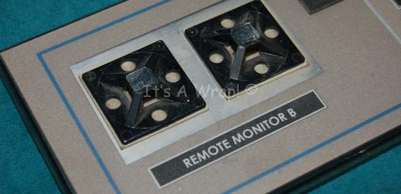 Description: A console button board like those appearing variously on the set of sickbay on board the “Enterprise NX-01” in episodes of Star Trek: Enterprise. The item is made from smoked acrylic with beveled edges and features a graphical application applied to the face. The graphic is adorned with multiple banks of rubber faux buttons colored black, white, and gray. Pair of additional accents are present on the left that are flanked by metallic silver adhesive detail. Inscriptions on the item read ‘Remote Monitor B’, ‘Internal Sensor A/B’ and ‘MedSys’. The item measures approx. 9.5 X 3.5 inches.